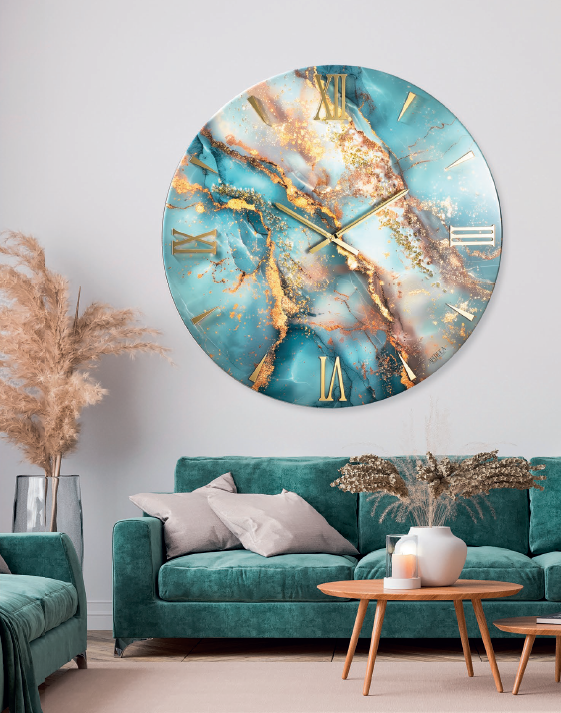 Decoro in foglia oro e cristalli tono su tono. Numeri in plex oro specchiato. Lancette in metallo cromato oro.